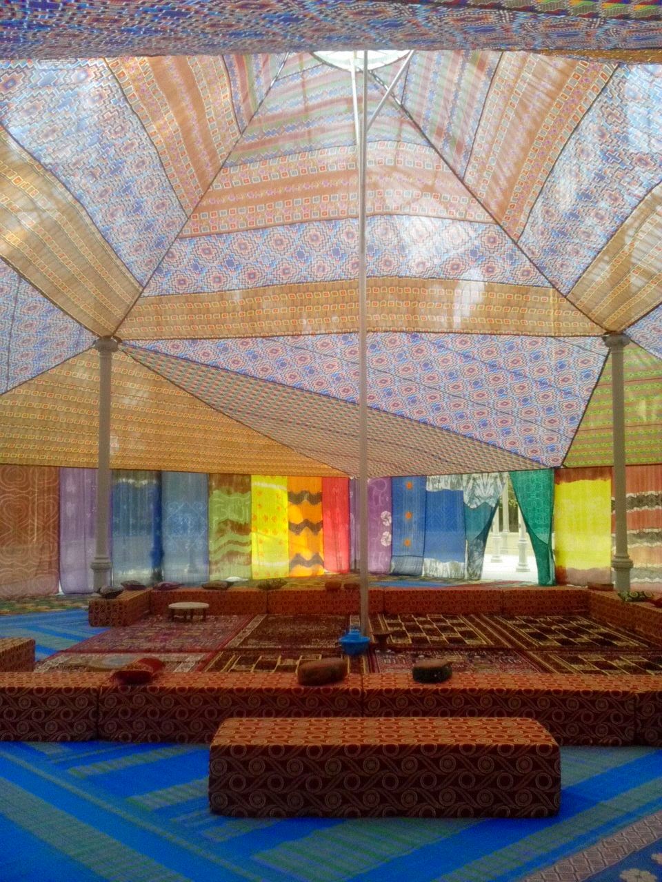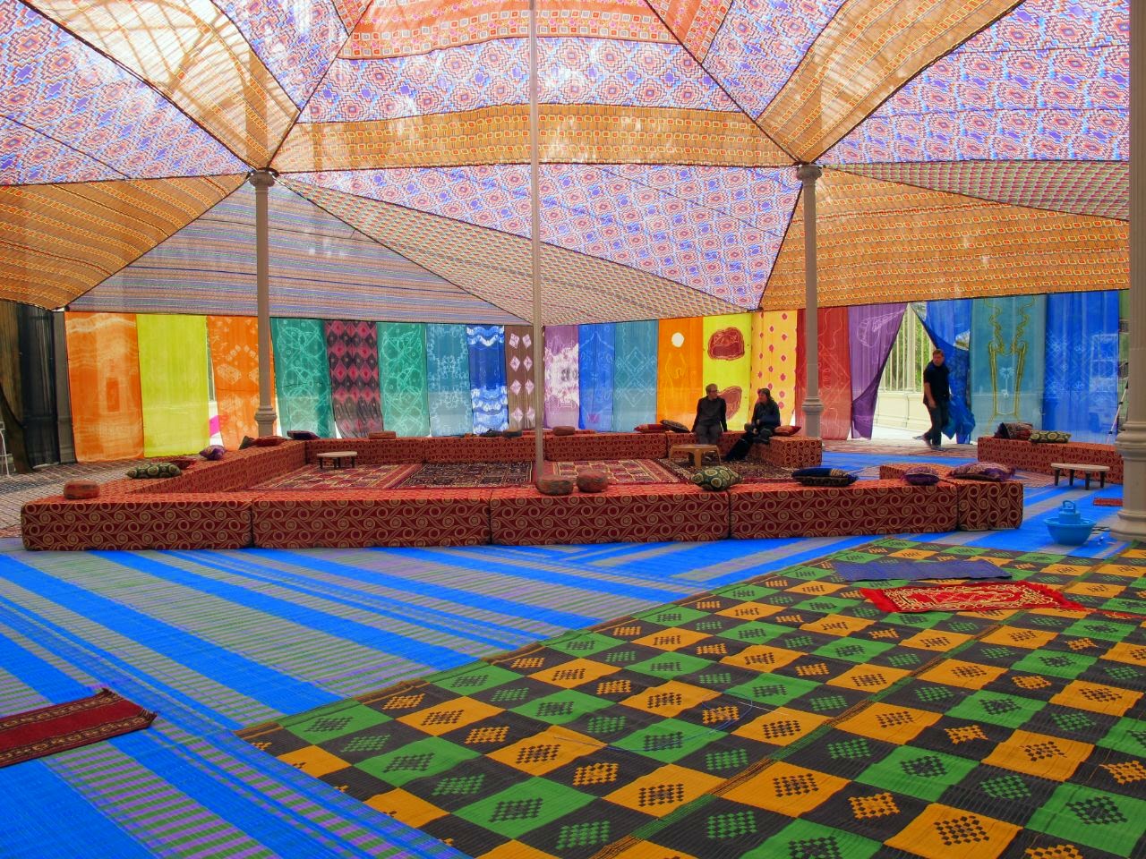 Los visitantes que se acerquen hasta el Palacio descubrirán este sorprendente espacio cuyo techo se conforma a partir de benias, tejido acrílico con motivos geométricos multicolores. En este caso, el artista ha sustituido las habituales benias de los laterales de la jaima por las melhfas.